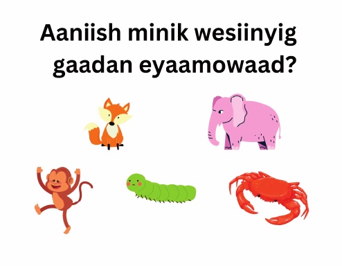 A book for early readers. We take a look at how many legs some animals have. Animals named at the back with comprehension questions. Written entirely in Anishinaabemowin for those who want to make Anishinaabemowin their home language.